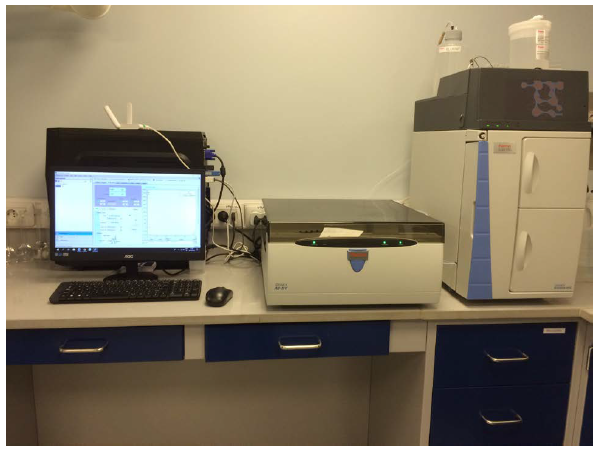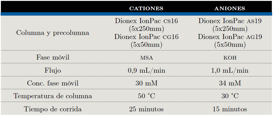 Se utiliza un cromatógrafo iónico marca Thermo Scientific modelo Dionex Integrion HPlC (Figura 1). El cromatógrafo incluye los siguientes módulos: a) generador de eluente; b) sistema de bombeo; c) compartimento para columna y guarda columna; d) detector de conductividad; e) autosampler Thermo Scientific Dionex AS-DV con capacidad para 50 muestras. Se controla el equipo a través del programa Chromeleon, que fija todos los datos correspondientes a la técnica a realizar. Las corridas se llevan a cabo ajustando las condiciones de trabajo según se analicen cationes o aniones (Tabla 1) (Trujillo, et al., 2009).