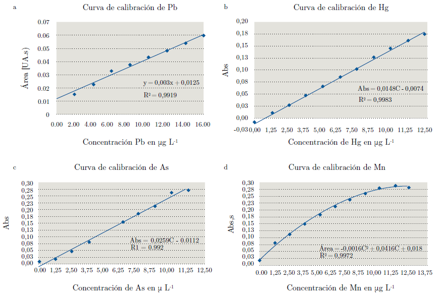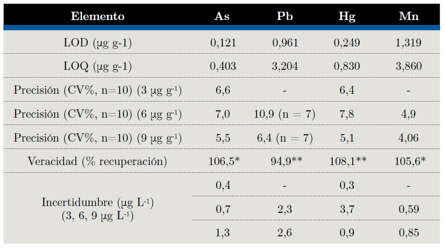 Debido a los niveles admitidos para los diferentes analitos se evaluó un rango lineal de 0 a 12,5 μg L-1 para cada elemento. Se realizaron fortificaciones antes de las digestiones para evaluar la veracidad, además del uso del material de referencia certificado. El modelo de mejor ajuste se evaluó mediante inspección visual, coeficiente de determinación (R2) y la prueba lack of fitness (LOF). El efecto matriz fue evaluado con el material de referencia certificado para Pb, Hg y Mn (n=8). Dada la baja concentración del As en material de referencia, que no puede ser detectada por estas técnicas (EAA), la veracidad se evaluó mediante una prueba t-Student.