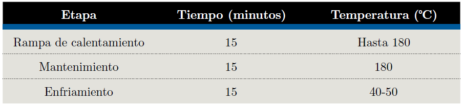 Para la digestión de las muestras se evaluó el contenido de HNO3 necesario para obtener una solución límpida y sin suspensiones. Se utilizaron diferentes concentraciones de HNO3 (100% v/v, 50% v/v y 25% v/v). Finalmente, la digestión se realizó con 25 mg de pelo y 10 mL de HNO3 25% v/v, utilizando el método de digestión diseñado para cabellos incluido en el equipo de horno microonda Mars 6, CEM. El programa de temperaturas se presenta en la Tabla 1.