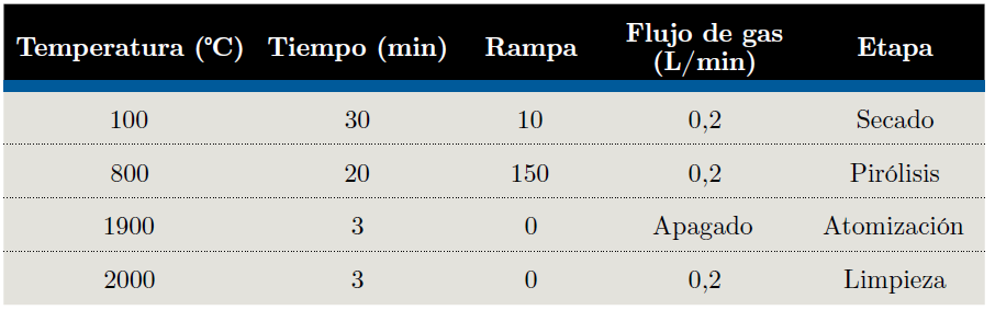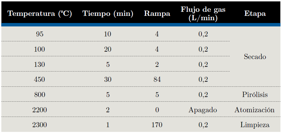 Las condiciones de ET-AAS se optimizaron para Mn y Pb. No se necesitó ningún modificador de matriz para Mn, pero en el caso de Pb se utilizó fosfato de amonio de 5 g L-1. Las temperaturas óptimas de pirólisis y atomización fueron 800/1900 ℃, y 800/2200 ℃ para Mn y Pb, respectivamente. En las Tablas 2 y 3 se presentan los programas de temperatura utilizados.
