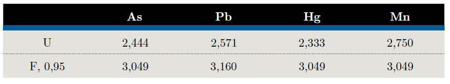 Los límites de cuantificación (LOQ) y límites de detección (LOD) se calcularon con los blancos (n=10), utilizando el criterio 10s y 3s (Eurachem, 2014). La precisión como repetibilidad se evaluó en tres niveles de concentración (3, 6 y 9 μg L-1, n=10). La precisión intermedia se estudió para la variable tiempo comparando los valores medios. La veracidad se evaluó con un material de referencia certificado para el caso de Mn y Hg (n=8); para el As y Pb fue evaluada utilizando la recuperación en dos niveles diferentes de concentración (n=2), debido a la baja cantidad de As en el material, y al efecto matriz en Pb. La evaluación de la incertidumbre se realizó mediante el protocolo PLB05 del CEQUIMTOX, que establece que, en caso de contar con interlaboratorios, la incertidumbre (U) se calcula como el doble de la desviación estándar de la precisión intermedia.