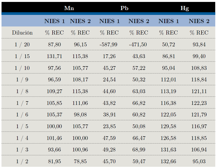 Para Hg y Mn el efecto matriz también se evaluó utilizando el material de referencia certificado. Se hizo un duplicado de las diluciones y se interpoló en una curva de calibración en HNO3 0,2%, que se muestra en la Tabla 6, donde se pueden ver los porcentajes de recuperación de las diferentes diluciones, mostrando que no se evidencia efecto matriz.