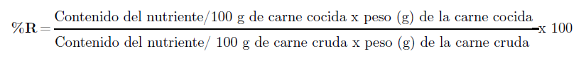Los porcentajes de retención de selenio luego de las cocciones fueron calculados utilizando la guía de Bognár y Piekarski publicada en el año 2000. Se trata de una guía informativa muy completa sobre la evaluación y cálculo de los porcentajes de retención de minerales (y otros nutrientes) en platos preparados luego de algún tipo de cocción, tomando como referencia una porción de 100 g y contemplando en el cálculo la pérdida de peso de la pieza durante el proceso de cocción (Bognár y Piekarski, 2000). La ecuación utilizada fue: