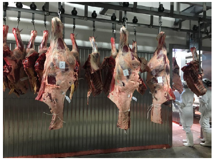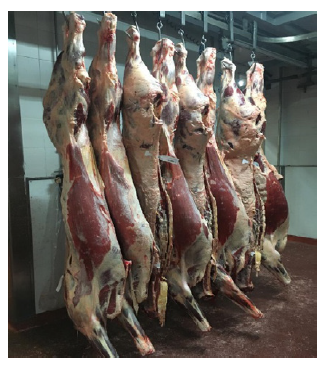 Se muestrearon 20 medias canales con 36 horas de maduración sanitaria. El 50% de las medias canales provenían de animales con sistemas de alimentación terminados en pasturas, mientras que el otro 50% fue terminado a grano (feed-lot). En el cuarteo se obtuvieron el asado, la herradura y el corte pistola. En las Figuras 1 y 2 se muestran los cortes de uno de los muestreos. El asado y el corte pistola fueron identificados mediante etiquetado para obtener correspondencia entre los cortes a bajar en el desosado (cuadril y bola de lomo) y los asados previamente separados. La etiqueta de trazabilidad (SEIIC) acompañó los cortes en todo el proceso (Figura 3).