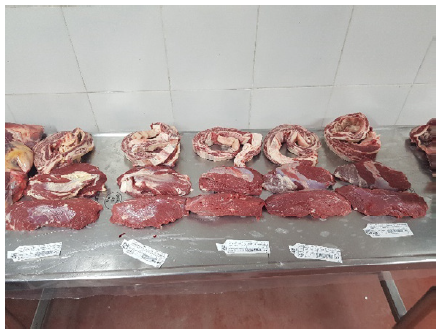 En el desosado se bajaron los cortes y se retiraron de la línea de producción junto con la etiqueta de trazabilidad. Se extrajo una porción de aproximadamente 500 g de cada corte asado (centro de la parrilla costal), cuadril (Bíceps Femoral) y bola lomo (músculo Vastus Intermedius). Las porciones se etiquetaron, se envasaron al vacío y se llevaron a Facultad de Química en conservadoras refrigeradas.