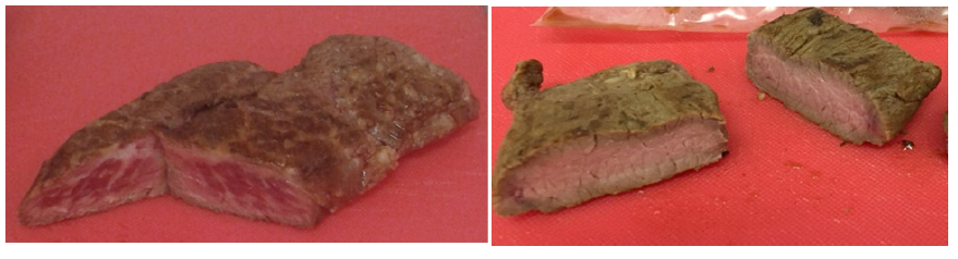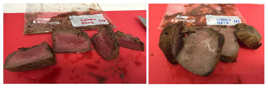 Se buscó obtener dos puntos de cocción: poco cocido y muy cocido. En la Tabla 1 se resumen las condiciones de temperaturas de cocción según el corte para ambos puntos y en las Figuras 4a6 se muestra el aspecto del corte luego de la cocción.