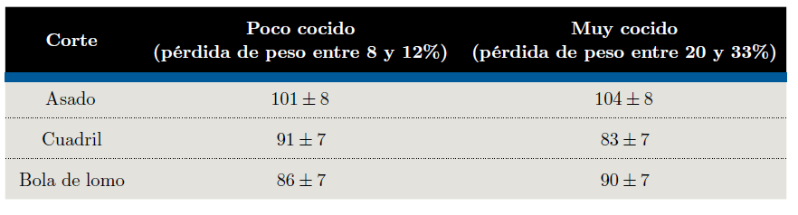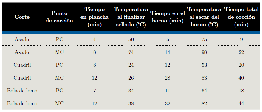 Las cocciones se realizaron en plancha de aluminio con recubrimiento antiadherente Teflón® (Ufesa, modelo GR7451) y en horno eléctrico (Delne, modelo Te-5604 i). Se pesaron las muestras de cada corte (asado, cuadril y bola de lomo) antes y después de la cocción para establecer la pérdida de peso en todos los casos. El proceso general consistió en sellar el corte en una plancha, como primera etapa, hasta alcanzar una determinada temperatura en el centro (Tabla 1) y posteriormente terminar la cocción en horno. La temperatura se controló en el centro de los cortes mediante una sonda de temperatura (ThermaQ): la temperatura de la plancha fue 300 ℃ y la del horno fue en promedio 250 ℃.