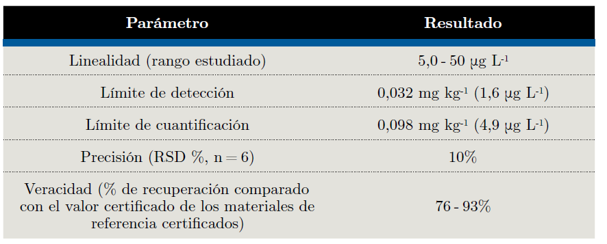 Dado que se trata de una técnica que no se utiliza como método estándar para esta determinación se realizó la correspondiente validación. Se evaluaron los principales parámetros de desempeño (linealidad, límites de detección y cuantificación, precisión y veracidad), siguiendo las recomendaciones de la Guía Europea de validación Eurachem (Magnusson y Örnemark, 2014).