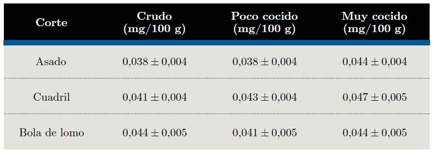 El consumir la carne menos cocida, lo que generalmente se denomina “bien jugosa”, con el centro de color rojo, o hacerlo en forma más cocida, “bien cocida” o “pasada”, no afecta significativamente el contenido del elemento en el alimento.