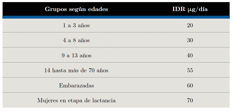En la Tabla 5 se muestran los valores de IDR para Se según la etapa de la vida.
