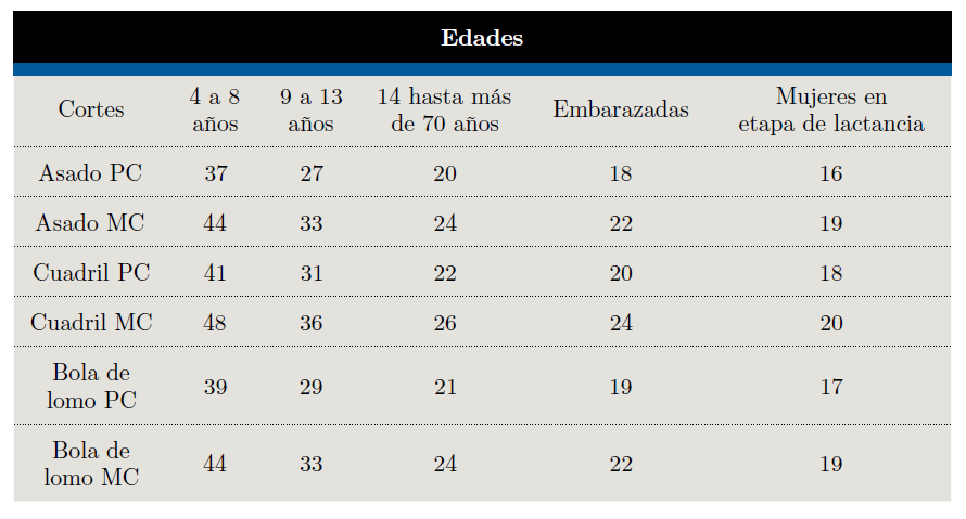 Los estudios sobre valor nutricional de un alimento deben evaluar las concentraciones de los nutrientes en la forma en que el alimento puede ser consumido, en el caso de la carne vacuna se consume cocida (el punto de cocción es a gusto del consumidor). Al analizar los resultados obtenidos, según el contenido de Se en cada corte y la cocción y la IDR por edades, es posible tener una idea del porcentaje de la necesidad diaria que este alimento puede cubrir. Para esto se consideró una porción de 100 g de carne en todos los casos. En la Tabla 6 se presentan los resultados.