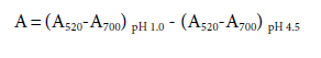 Anthocyanins content was measured using a pH-differential protocol (Giusti and Wrolstad, 2001) with some modifications. An aliquot of 40 mL of methanolic extract was placed in the microplate and diluted with 200 mL of potassium chloride (0,025 M; pH 1,0) or sodium acetate (0,4 M; pH 4,5) buffers. Absorbance was measured at 520 and 700 nm. The absorption (A) of the anthocyanins in the diluted samples was calculated from the Equation 1 and anthocyanins concentration was calculated using the cyanidin 3-glucoside extinction coefficient (26.900 M-1cm-1).