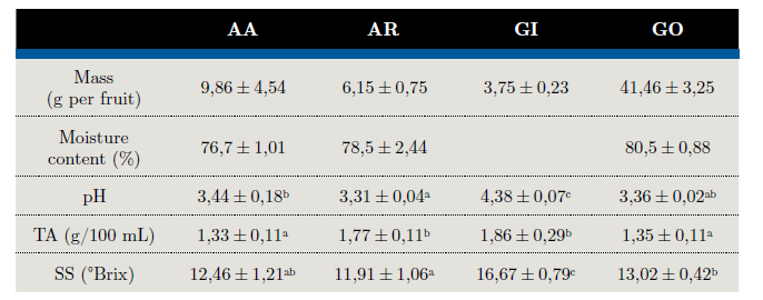The highest values of pH, TA and SS content were found in ‘Guaviyú’ (GI) fruit. The SS:TA ratio is one of the most important parameters to determine the taste and palatability of the fruit and is correlated with consumer acceptability (Crisosto and Crisosto, 2005). In the evaluated fruits this ratio was significantly low for AR, indicating the predominance of acid on sweet taste, confirmed by the high TA and low SS values.
