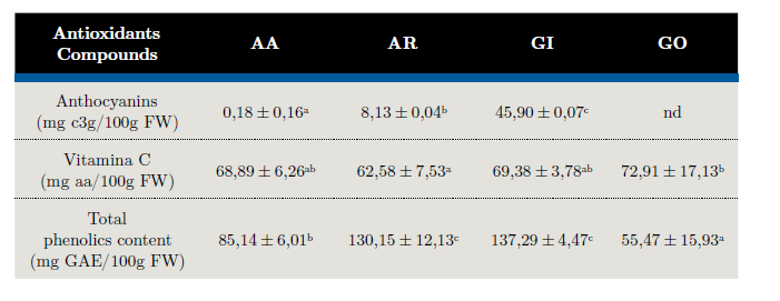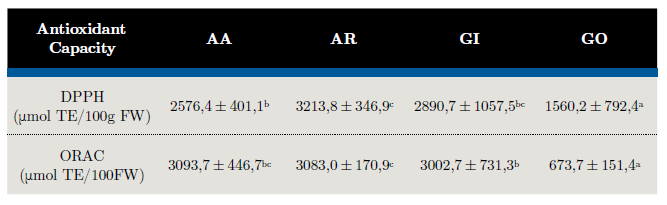 Table 3 shows the antioxidant activity determined by DPPH and ORAC assays. The antioxidant capacity displayed in native fruits varied according to the species analyzed (p < 0,05). The AA, AR and GI fruits have the highest DPPH values, more than two times the activity observed in GO (1560,2 ± 792,4 mmol TE/100g FW).
