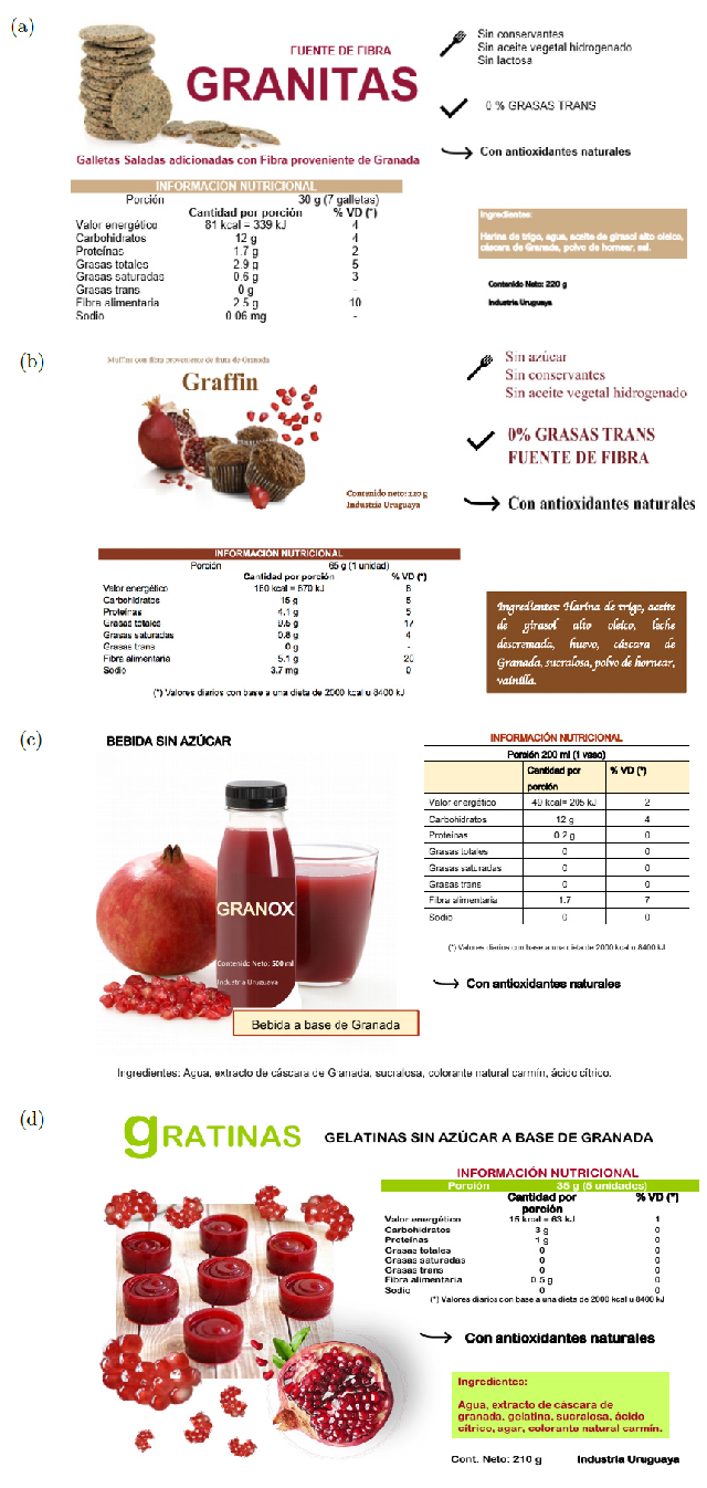 Se desarrollaron cuatro alimentos funcionales. La fracción soluble se utilizó como ingrediente en la producción de gelatinas y de una bebida, mientras que la insoluble se incorporó a galletas saladas y muffins. Todos los productos fueron formulados sin azúcar. Las galletas y muffins se formularon para que cumplieran con el claim “fuente de fibra”, según lo establecido en el MERCOSUR (2012).