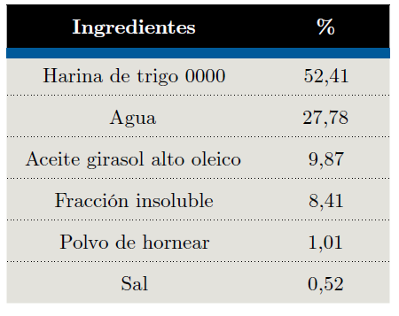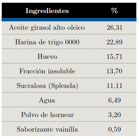Cabe recalcar que según el reglamento técnico MERCOSUR sobre información nutricional complementaria, declaraciones de propiedades nutricionales, Resolución Nº 01/12 (MERCOSUR, 2012), el claim “fuente de fibra” está autorizado si un alimento posee como mínimo 2,5 g de fibra por porción. En el caso de las galletas, la porción contempla 30 g y para los muffins 60 g, por lo que se decidió formularlos de manera tal de poder rotularlos como “fuente de fibra”. Se calculó la cantidad necesaria de extracto insoluble para que el producto final cuente como mínimo con tal porcentaje de fibra. La razón por la cual se decidió utilizar la mínima cantidad fue el fuerte impacto de los atributos sensoriales que presentan los extractos de la cáscara de granada, tales como el amargor y la astringencia, que pueden afectar fácilmente la sensibilidad de los consumidores a la hora de calificar a los productos.