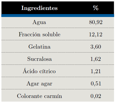 Cabe destacar que el orden de incorporación de los ingredientes en el caso de las gelatinas influye en la textura y consistencia, por lo que luego de recurrir a varias formulaciones se obtuvo el siguiente orden óptimo. Se mezcla inicialmente la gelatina (en forma de polvo) con agua a temperatura ambiente, luego se somete la mezcla a temperatura y al observar la primera burbuja de ebullición se agrega el agar-agar. Se continúa revolviendo hasta que hierve totalmente y una vez homogenizada la mezcla se retira del calor. En este momento se agrega la fracción soluble, sucralosa, ácido cítrico y colorante natural carmín (en ese orden) y se mezcla hasta que no queden grumos y quede todo unificado. Por último, se vierte la solución en moldes de silicona. Con respecto a los productos horneados, las galletas fueron horneadas durante 15 min a 180 ℃, mientras que los muffins se hornearon a 180 ℃ por 20 min.