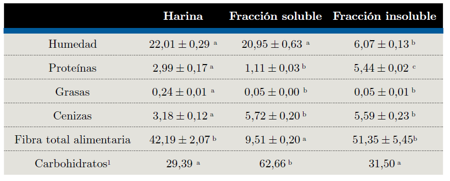 La Tabla 5 revela un alto contenido de fibra alimentaria total, tanto para la harina como para la fracción insoluble y se aprecia una diferencia significativa entre la fibra presente en estos y en el extracto soluble. El extracto insoluble presenta 51,35 g/100g de fibra y se puede considerar una “fuente” de fibra dado lo reportado por Larrauri (1999), quien observó esta característica para matrices con fibra superior a 50%.