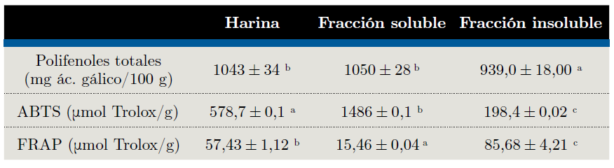 Los valores de capacidad antioxidante obtenidos por FRAP para la harina, fracción soluble e insoluble resultaron con una tendencia opuesta a la obtenida por ABTS. Este resultado no concuerda con lo observado por Fischer et al. (2010), quienes determinaron capacidad antioxidante por ABTS y FRAP en jugo, cáscara y mesocarpio de granada, mostraron una correlación entre ambos análisis y señalaron que el mesocarpio presentó mayor medición tanto de ABTS como de FRAP.