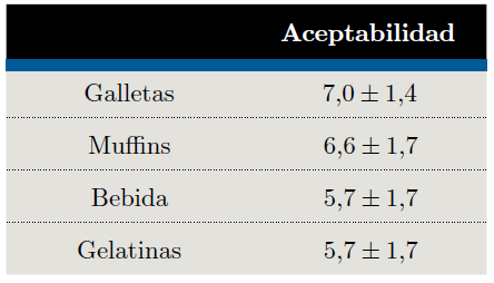 La aceptabilidad obtenida para cada producto se observa en la Tabla 7.