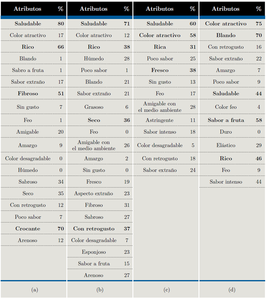 De acuerdo al tipo de producto, se evaluaron atributos específicos mediante el uso de preguntas check-all-that-apply (CATA). Dentro de una lista presentada, los consumidores identificaron los atributos que consideraron que mejor describen cada producto.