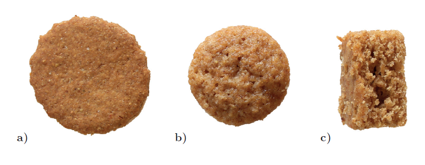 En la Figura 1 se puede observar una fotografía de los productos desarrollados listos para consumir. Todas las formulaciones poseen un color amarronado y una textura visual arenosa. El color observado en los productos desarrollados es consistente con los resultados obtenidos por Alongui y otros (2019), que obtuvieron un mayor grado de pardeamiento en galletas con harina de manzana al compararlas con la formulación de referencia. Esta diferencia fue atribuida no solo a la diferencia de color provista por la materia prima sino también a la presencia de concentraciones más altas de fructosa y glucosa que intervienen en las reacciones de Maillard, generando una mayor concentración de melanoidinas y otros productos de la reacción, que a su vez intervienen en el sabor del producto.
