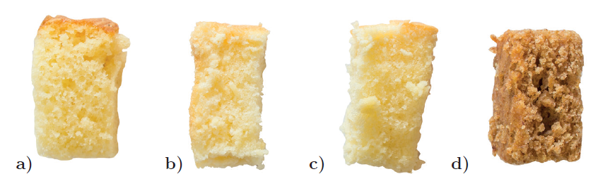 La Figura 2 muestra una fotografía de los productos evaluados. A simple vista, se puede observar una diferencia significativa entre el color de la torta elaborada con la premezcla experimental y las tortas elaboradas con las premezclas comerciales. La torta experimental resultó mucho más oscura; como se mencionó anteriormente, se debe principalmente al color marrón de la harina de manzana, pero también puede deberse a un mayor grado de ocurrencia de las reacciones de Maillard por el aumento de las concentraciones de glucosa y fructosa (Alongui, et al., 2019). A su vez, la premezcla experimental se ve menos esponjosa que las demás, con una textura visualmente más rugosa, lo cual también puede deberse a la incorporación de fibra. Según Quiles y otros (2018), los principales problemas generados por la incorporación de fibra de bagazo de frutas en productos horneados provienen de los efectos perjudiciales que genera la fibra en la creación de una estructura aireada. En general, la sustitución de la harina de trigo por fibra disminuye el desarrollo del producto, y debido a la mayor densidad, la textura de los productos finales se vuelve más firme, gomosa y menos cohesiva. De hecho, la textura es el atributo sensorial más influenciado por la presencia de fibra en tortas y muffins, siendo el principal motivo de rechazo de estos productos frente a los convencionales.