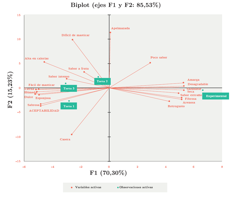 De acuerdo con los resultados del análisis de varianza en los datos de aceptabilidad ya mencionados, las tortas 1 y 3 tuvieron los mayores puntajes de aceptabilidad general, por lo que los términos esponjosa, húmeda, tierna y dulce podrían ser considerados como atributos que tienen un impacto positivo en la aceptabilidad, mientras que arenosa, sabor extraño y seca tendrían un impacto negativo.