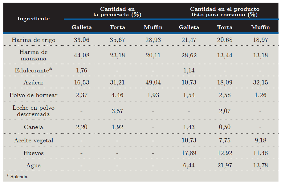 Se formularon premezclas para galletas, muffins y tortas, con sustitución parcial de harina de trigo por harina de manzana, para estudiar los efectos de este ingre- diente en las características sensoriales del producto. El porcentaje de sustitución se eligió de manera tal que el producto pudiera etiquetarse como “fuente de fibra”, que corresponde a un contenido de 2.5 g de fibra por porción de producto listo para consumo, según el reglamento Mercosur, (Mercosur, 2012). Los ingredientes básicos para la elaboración de las premezclas fueron obtenidos en el mercado local. Las formulaciones para cada producto pueden verse en la Tabla 1, así como su reconstitución con agua, aceite y huevos.