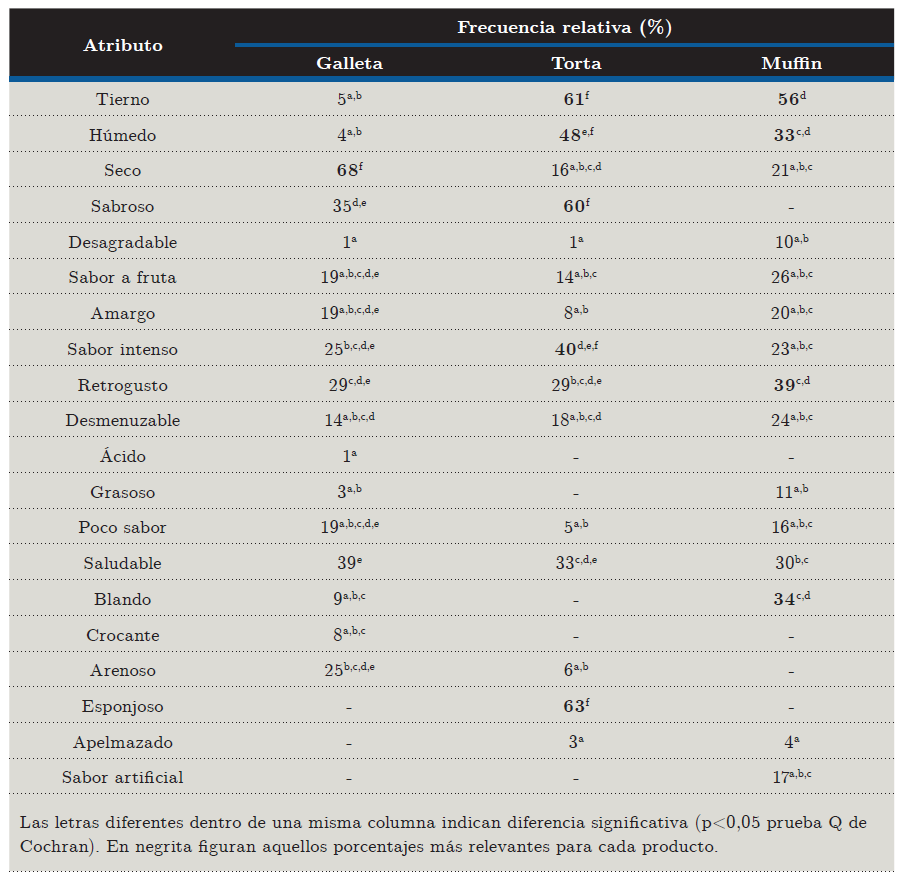 De acuerdo al análisis de frecuencias calculadas para la pregunta JAR, la mayoría de los consumidores percibió el dulzor de la torta como justo (65.0%), mientras que la galleta y el muffin fueron clasificados como no suficientemente dulces (36.8% y 31.4% respectivamente). Se esperaba que la galleta fuera percibida como menos dulce, teniendo en cuenta que es la formulación con mayor porcentaje de harina de manzana y menor contenido de azúcar. Sin embargo, aunque el muffin fue formulado con el contenido más alto de azúcar, también fue clasificado como no suficientemente dulce. La frecuencia de uso de los términos que los consumidores hallaron adecuados para describir a cada formulación se muestra en la Tabla 2. Entre los más relevantes, la galleta fue percibida como seca, la torta fue percibida como húmeda, tierna, sabrosa, esponjosa y de sabor intenso, y el muffin fue percibido como tierno, húmedo, con retrogusto y blando. Muchos consumidores percibieron que la torta tenía un sabor intenso debido a la canela. De hecho, una gran parte de ellos escribió en la evaluación “demasiada canela”.