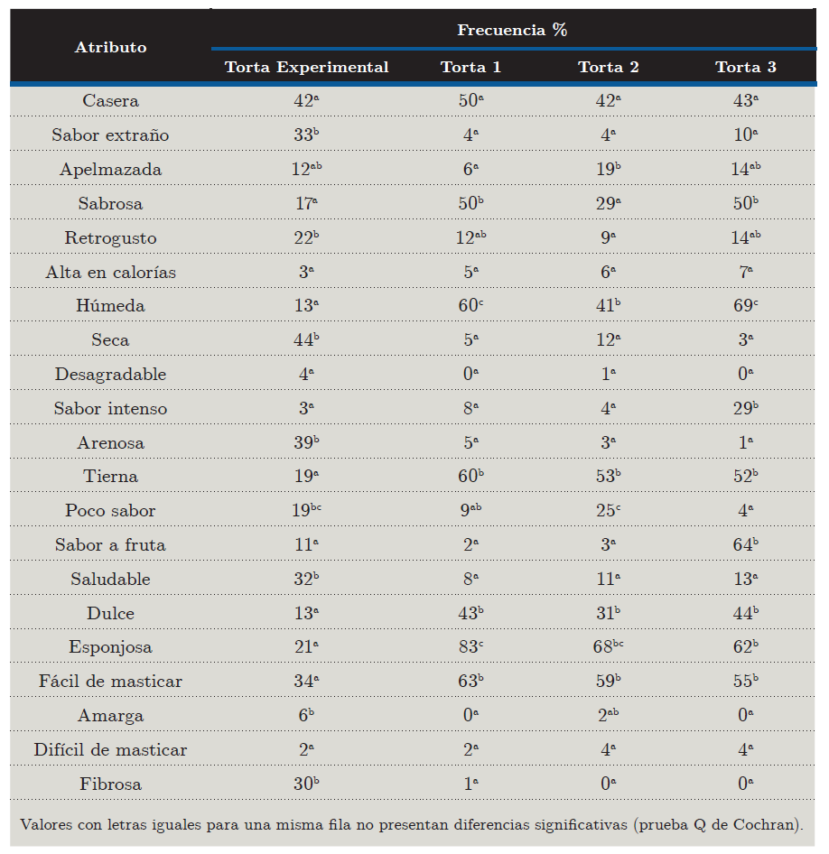 Los porcentajes de términos que los consumidores hallaron adecuados para describir a cada muestra se pueden observar en la Tabla 3. De los 21 términos incluidos en la pregunta, 17 mostraron diferencias significativas entre las muestras, particularmente entre la torta experimental y las comerciales, para los atributos sabor extraño, húmeda, seca, arenosa, tierna, saludable, dulce, esponjosa, fácil de masticar y fibrosa. De acuerdo con los porcentajes de términos que los consumidores hallaron adecuados para describir a cada muestra, se observa que, en general, los consumidores percibieron diferencias en las características sensoriales y no sensoriales de las tortas evaluadas.