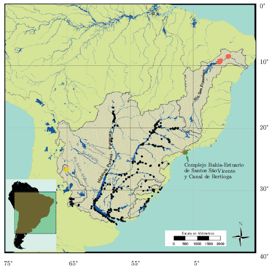 L. fortunei continuó expandiendo su distribución hacia el norte y fue reportada en cuencas vecinas, incluyendo las del río San Francisco (Barbosa, et al., 2016), del Complejo Bahía-Estuario de Santos, São Vicente y del Canal de Bertioga (Senske, et al., 2019), estas dos últimas en Brasil (Figura 1). Su presencia en estas cuencas parece más relacionada a una introducción secundaria, producto de la actividad de algún vector de introducción más que a una expansión natural de la distribución; por ejemplo, el agua de lastre para el caso del Complejo Bahía-Estuario de Santos, São Vicente y del Canal de Bertioga (Senske, et al., 2019). Esta expansión hacia el norte en zonas tropicales contrasta con la falta de nuevos registros hacia el límite sur de su distribución en Sudamérica, donde hasta al momento no se han registra- do ríos ni otros cuerpos de agua colonizados por L. fortunei.