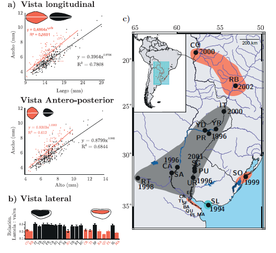 Limnoperna fortunei ha colonizado una gran diversidad de ambientes y, al menos con los estudios realizados hasta la fecha, ha fallado en colonizar otros. Sin embargo, a diferencia de lo que se ha descripto para otros bivalvos invasores, poco se conoce acerca de la respuesta fenotípica a condiciones ambientales adversas y cómo esta respuesta -junto a otros elementos clave como la capacidad de dispersión y la presencia de vectores- podría afectar su distribución. Un primer estudio a nivel regional en Sudamérica (Paolucci, et al., 2014b) permitió detectar variaciones morfológicas en esta especie basadas mayormente en cambios en las proporciones ancho-largo y ancho-alto de sus valvas (Figura 2a). Más aún, mostró que esas variaciones parecen tener un efecto importante a nivel del desarrollo interno, afectando mayormente al área branquial relativa (definida en función del área total del organismo para incluir la variación por tamaño: Figura 2b). Algunas poblaciones mostraron alta proporción de mejillones de mayor relación ancho/largo, resultando en mejillones menos alargados que las proporciones normales (Figura 2c) descriptas originalmente para esta especie (Morton, 1973). Aunque las poblaciones analizadas por los autores resultaron de gran heterogeneidad, abarcando diversidad de ambientes y características, tres factores fueron destacados por los análisis como aparentemente relevantes para describir estas variaciones: los sólidos totales en suspensión, probablemente la baja concentración de oxígeno disuelto o la elevada contaminación registrada en algunas de las poblaciones estudiadas en el Río de la Plata (QU, BU, y PL en la figura 2b y 2c correspondientes a las poblaciones de Quilmes, Buenos Aires y Punta Lara). Desde el punto de vista de la morfología de las valvas, las poblaciones parecen agruparse en dos morfologías distintivas, con mejillones más alargados (poblaciones marcadas en negro en la Figura 2) y mejillones más anchos y cortos (poblaciones marcadas en rojo, Figura 2) con un diferente desarrollo branquial. Al comparar la variación morfológica con la estructura genética poblacional de estas mismas poblaciones, utilizando indicadores de diversidad nucletídica y haplotípica de datos publicados por Zhan y otros (2012), y Ghabooli y otros (2013), y que por cierto mostraron una gran heterogeneidad espacial y diversidad genotípica, no se pudieron atribuir las distintas morfologías a los genotipos hallados. En base a este análisis, los autores de los tres trabajos citados sugieren en Paolucci y otros (2014b) que estas variaciones podrían originarse en un proceso de plasticidad fenotípica. Sin embargo, es razonable pensar que más trabajos deberían ser realizados para confirmar o descartar estos hallazgos.
