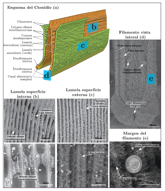Las branquias en L. fortunei están formadas por un solo tipo de filamento (branquias homorabdicas), pero cada filamento está cubierto por distintos tipos de cilios, cuyo movimiento conjunto es determinante en las funciones de respiración, alimentación y transporte de partículas. Los filamentos no presentan cilios adfrontales en la superficie interna de la lamela (Figura 3b), pero sí abundantes cilios frontales en la cara externa (lamela superficie externa, Figura 3c), y cilios laterales orientados hacia el espacio entre filamentos adyacentes (Figura 3e). Los cilios laterales (Figura 3e) son responsables de crear las corrientes que desplazan los fluidos a través de los filamentos entre las cámaras infra y supra branquial (definidas por las lamelas), y por consiguiente las corrientes inhalantes y exhalantes (Morton, 2015). Limnoperna también posee un tipo adicional de cilios, presentes también en otros mitílidos, llamados cirros latero-frontales, pues están constituidos por la unión de varios cilios y ubicados entre los cilios laterales y frontales (Figura 3d). Los cirros latero-frontales cumplen la función de filtrado, prolongándose lateralmente desde los filamentos hacia el espacio entre estos y captando las partículas que pasan (Figura 3d-e) para dirigirlas hacia los cilios frontales (Dillon, 2000). Estos últimos transportan dichas partículas hacia los canales orales marginales. A pesar de su importancia funcional, no se observaron diferencias morfológicas tanto para el ancho promedio de los filamentos como para la longitud y densidad promedio de los cilios entre las poblaciones estudiadas en Sudamérica (Paolucci, et al., 2014b).