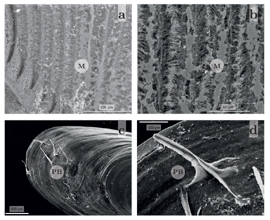 Así como fue observado en otros bivalvos (Ockelmann, 1983; Ockelmann y Dinesen, 2009; Dinesen y Morton, 2014), en L. fortunei se registró otra interesante variación en la morfología externa, que es la presencia de pelos bisales en el periostraco de ejemplares juveniles y adultos (Montalto y Rojas Molina, 2014). Dichos pelos bisales fueron reportados en organismos colectados mayormente en ambientes lénticos del río Paraná, y adheridos a las raíces de macrófitas flotantes. Dado que no se los registró en organismos colectados en ambientes lóticos, se concluyó que las condiciones físicas más rigurosas podrían estar impidiendo el desarrollo de estas estructuras, cuya presencia estuvo inversamente correlacionada con la velocidad de la corriente (Montalto y Rojas Molina, 2014). Estos pelos bisales también fueron observados por el autor de esta revisión en ambientes lóticos, en particular en organismos colectados entre las raíces de árboles a orillas del Canal Arias, en el Delta del Paraná (Figura 4c-d), donde la velocidad de la corriente suele ser más baja que en el curso principal. La mayoría de los autores que investigaron estas estructuras sugiere que su presencia estaría relacionada con una reacción a los depredadores por la aparente utilidad como camuflaje de las mismas (Ockelmann, 1983; Ockelmann y Dinesen, 2009; Dinesen y Morton, 2014).