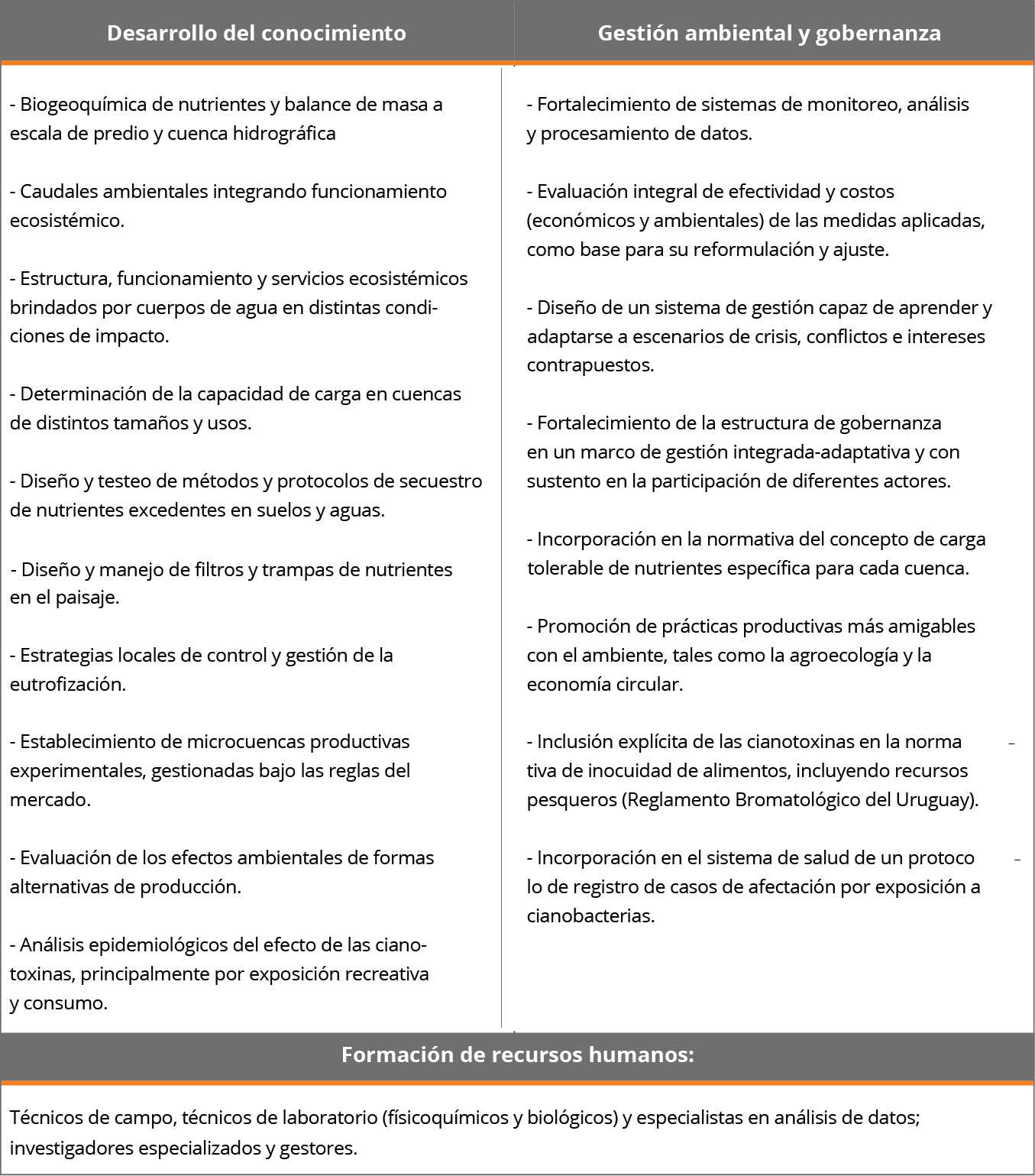 Para ajustar los sistemas productivos y promover la resiliencia natural de los ecosistemas, es clave la generación de conocimiento original específico y la innovación ajustada a la dinámica de nuestros ecosistemas y así contribuir a la toma de decisiones informada y basada en el mejor conocimiento científico disponible (Tabla 2) (Sharpley, et al., 2015).