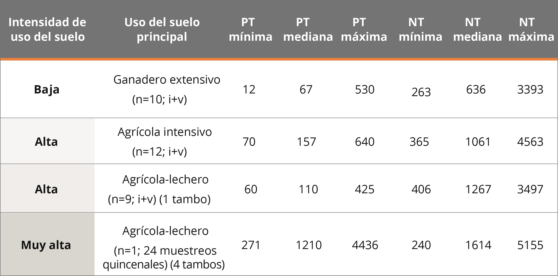 Tabla 1. Concentraciones de fósforo y nitrógeno total (PT y NT; µg.L-1) en el agua de arroyos en cuencas con diferente uso del suelo predominante, indicando valores mínimos, medianos y máximos.