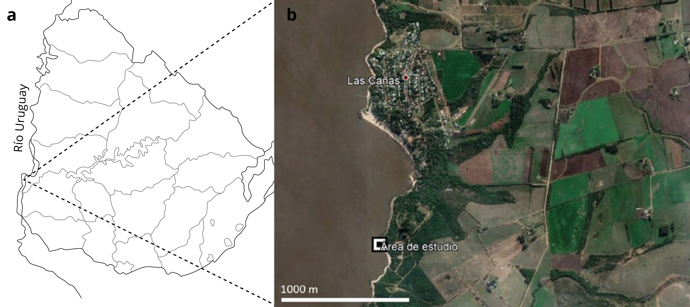 Figura 1. a) Mapa de Uruguay indicando la ubicación del balneario Las Cañas, en la porción inferior del Río Uruguay. b) Imagen de Google Earth mostrando el área de estudio localizada en Las Cañas, Río Negro.