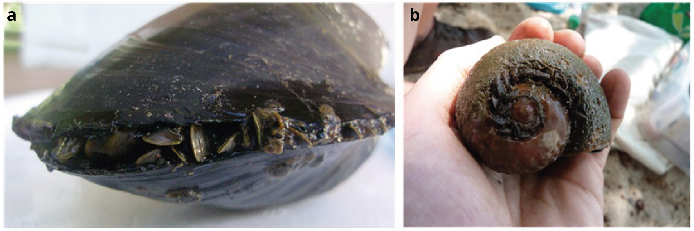 De acuerdo con los criterios de búsqueda escogidos, no se encontraron publicaciones con foco en los efectos de la invasión de L. fortunei sobre la fauna bentónica nativa del Río Uruguay. Sin embargo, se encontraron algunos trabajos presentados en congresos y evidencia fotográfica que indican interacciones puntuales de este bivalvo invasor con otros organismos. Específicamente, Eugui y otros (2012) reportaron biofouling de Limnoperna sobre algunos gasterópodos, como Pomacea insularum y P. megastoma. Asimismo, en el bajo Río Uruguay se han registrado ejemplares de mejillón dorado asentados incluso dentro de algunos bivalvos nativos vivos, como Leila blainvilliana (Cristhian Clavijo, obs. pers., Figura 2a), particularmente en la localidad de Fray Bentos, Departamento de Río Negro. Además, se han registrado asentamientos puntuales de mejillones sobre grandes gasterópodos, como P. maculata, en la localidad de Nueva Palmira, Departamento de Colonia (Cristhian Clavijo, obs. pers., Figura 2b).