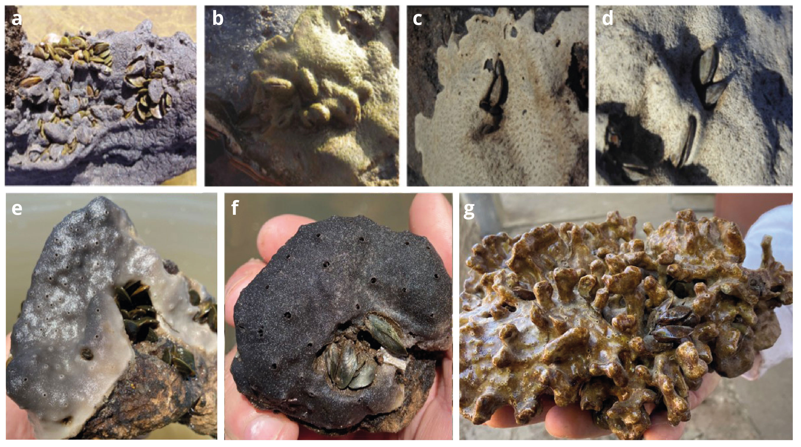 Figura 3. a) Individuos de mejillón dorado siendo cubiertos por Trochospongilla repens (Porífera, Spongillidae), Foto: Cristhian Clavijo. b-g) Individuos de mejillón dorado siendo cubiertos por ejemplares de la familia Spongillidae, especie sin identificar. Fotos: Sebastián Gómez-Barboza e Iván González-Bergonzoni.