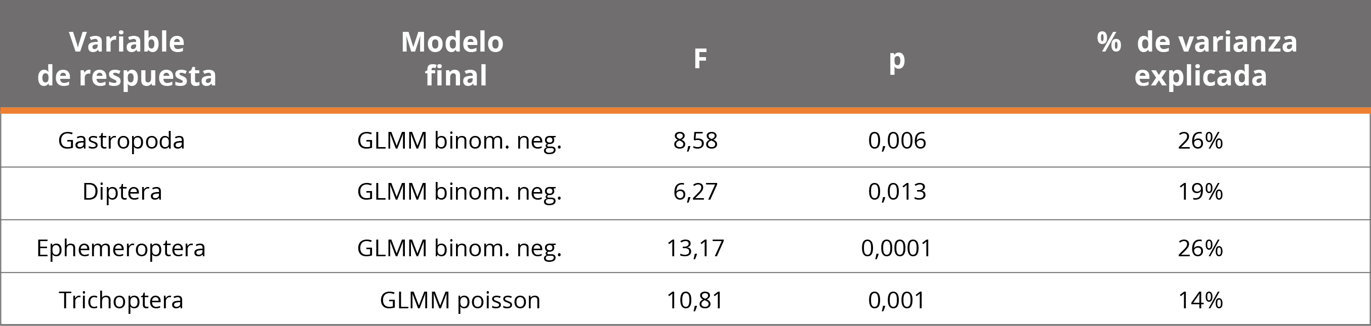 Tabla 2. Modelos lineales generalizados de efectos mixtos (GLMM, por sus siglas en inglés) ajustados para la abundancia de cada grupo de macroinvertebrados nativos como variable de respuesta, utilizando la abundancia de mejillón como variable explicativa de efecto fijo y la jaula como variable de efecto aleatorio. Se detalla el modelo seleccionado, su significancia (p- valor) y F-valor, y el porcentaje de varianza explicada por el mismo.