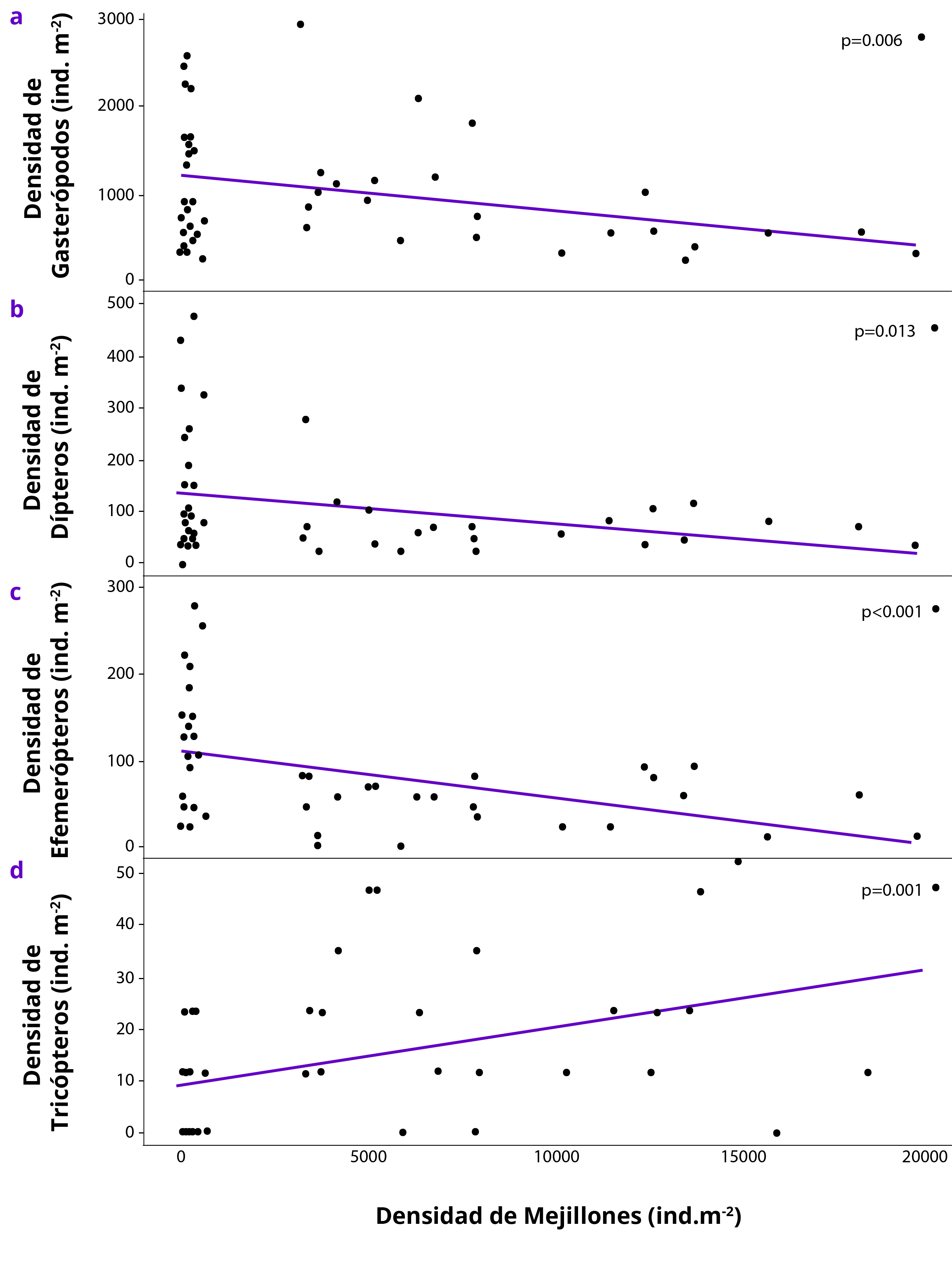 A partir de los modelos ajustados, se encontró que existe relación lineal negativa significativa entre las abundancias de los grupos de invertebrados bentónicos nativos más frecuentes y las abundancias de L. fortunei. Específicamente, se encontró que las abundancias de gasterópodos, dípteros y efemerópteros se reducen significativamente a medida que las abundancias de mejillones aumentan (p=0,006; 0,013; 0,0001, respectivamente) (Tabla 2; Figura 4a, b y c). Contrariamente, las abundancias de tricópteros aumentan conforme se incrementa la abundancia de mejillón dorado (p=0,001) (Tabla 2; Figura 4d).