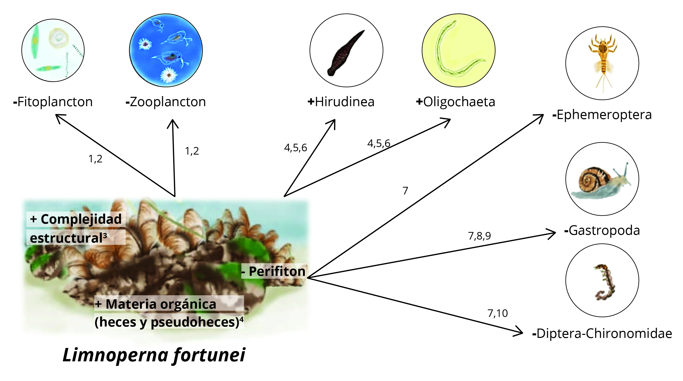 Figura 5. Implicancias de la invasión del mejillón dorado sobre el ecosistema y principales consecuencias positivas (+) y negativas (-) sobre los invertebrados bentónicos nativos. Se indica con un número cada referencia: (1) Cataldo, et al., 2012a; (2) Sylvester, et al., 2005; (3) Sardiña, et al., 2008; (4) Boltovskoy y Correa, 2015; (5) Sylvester, et al., 2007; (6) Duchini, et al., 2018; (7) Silva, et al., 2020; (8) Mansur, et al., 2003; (9) Darrigran, et al., 1998; (10) Linares, et al., 2017.