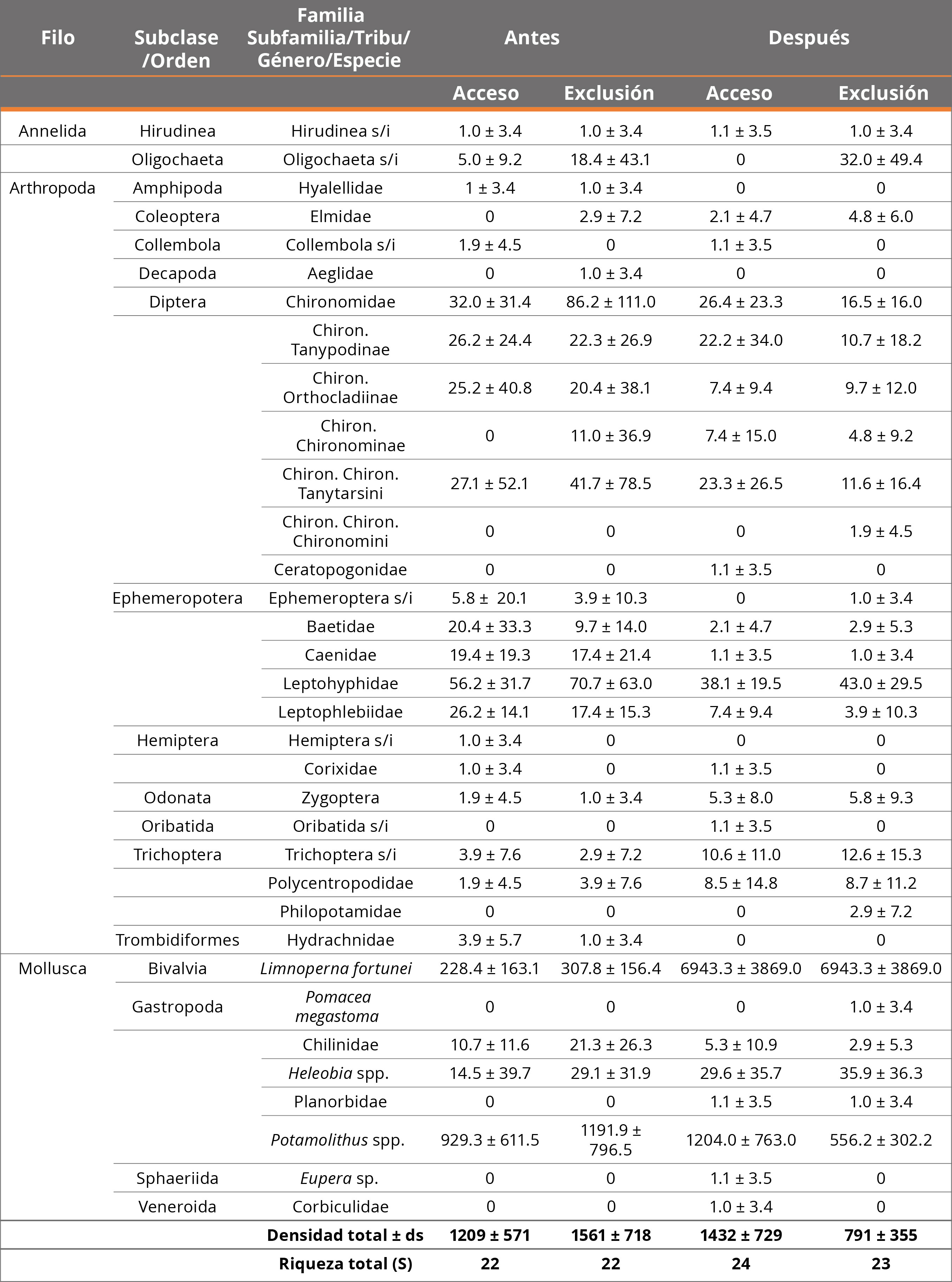 Tabla 1. Densidad media (± desviación estándar; ds) de todos los macroinvertebrados recolectados en cada tratamiento (acceso y exclusión) para cada muestreo: antes y después del asentamiento masivo de mejillones en los sustratos. Se encuentran ordenados por Filo (en orden alfabético), luego por Subclase u Orden, y finalmente por el mínimo nivel taxonómico identificado: Familia, Subfamilia, Tribu, Género y Especie. Se muestra la densidad total promedio y la riqueza de taxa. *s/i = taxón sin identificar.