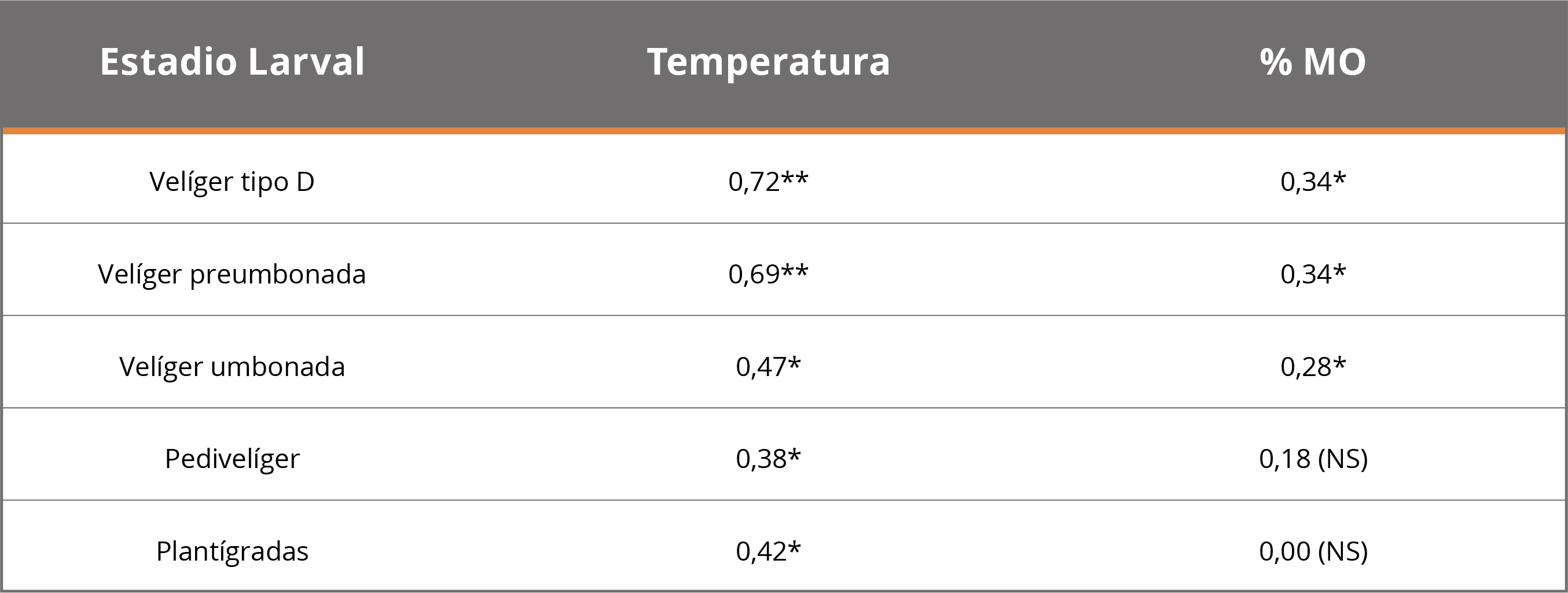 Tabla 3. Correlaciones entre las densidades de los estadios larvales en las CH con temperatura del agua y porcentaje de materia orgánica. R y p-valor (*95% y ** 99%). NS=No Significativo.