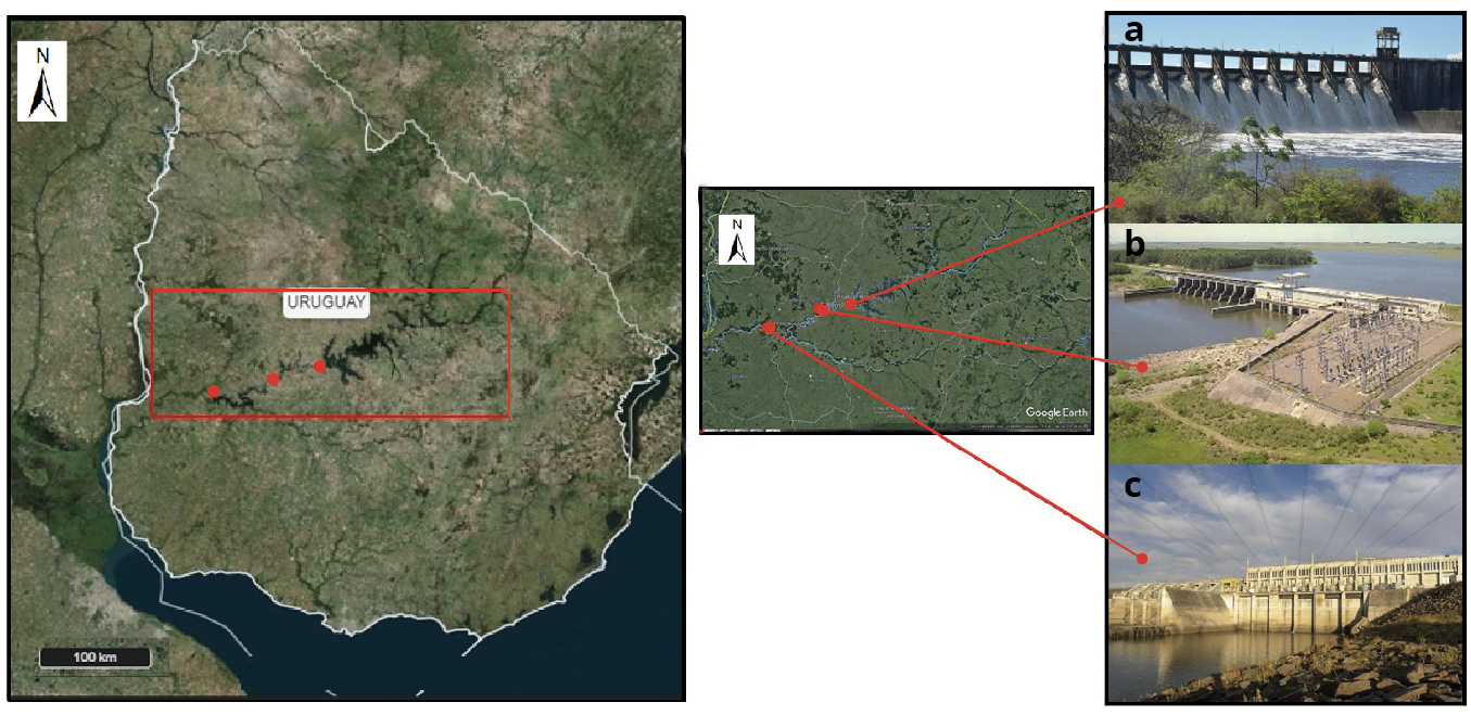 El Río Negro es el principal río interior de Uruguay, presenta una cuenca de 72000 km., de los cuales 68875 km. se encuentran en territorio uruguayo. Este río presenta un sistema de embalses (E-W): Rincón del Bonete (1070 km.), Baygorria (100 km.) y Palmar (320 km.), destinados a la producción de energía eléctrica, con una capacidad de generación de 600 MW (Conde y Sommaruga, 1999) (Figura 1). La CH Rincón del Bonete (situada en el embalse Rincón del Bonete) fue instalada en 1948, con una potencia de 155 MW (4 turbinas); la CH Baygorria fue puesta en funcionamiento en 1960 y presenta 108 MW (3 turbinas), mientras que la CH Constitución (embalse Palmar) comenzó a funcionar en 1982, con una potencia instalada de 333 MW (3 turbinas).