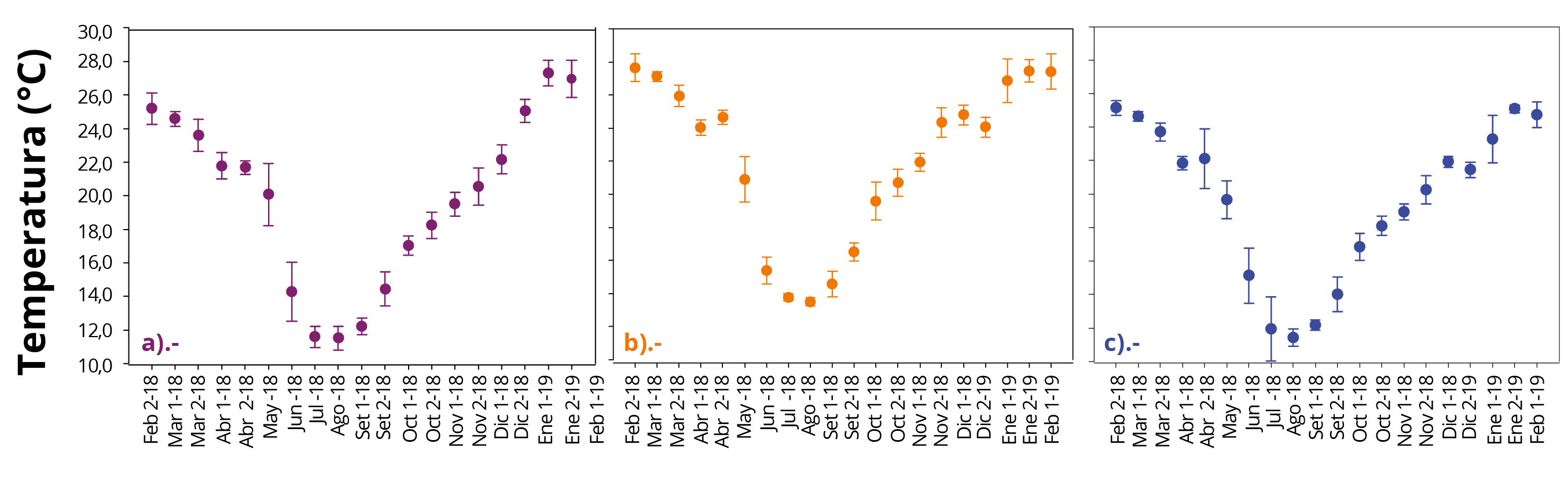 La temperatura promedio de los tres SR mostró una correlación significativa positiva con el promedio de larvas (r=0,63; n=54; p<0.001). Por otro lado, el incremento de la densidad larval en las tres CH se observó a partir de la segunda quincena de octubre 2018, cuando la temperatura del agua de los SR es mayor a 18ºC (Figura 2 y 3). La temperatura del agua es uno de los factores ambientales asociados al ciclo larval de L. fortunei, según diversos autores (Damborenea y Penchaszadeh, 2006; Darrigran, et al., 2007; Boltovskoy, et al., 2013; Giglio, et al., 2016). Dichos autores relacionan la presencia de larvas de la especie con temperaturas superiores a los 18°C, coincidiendo con los resultados encontrados en el presente estudio.