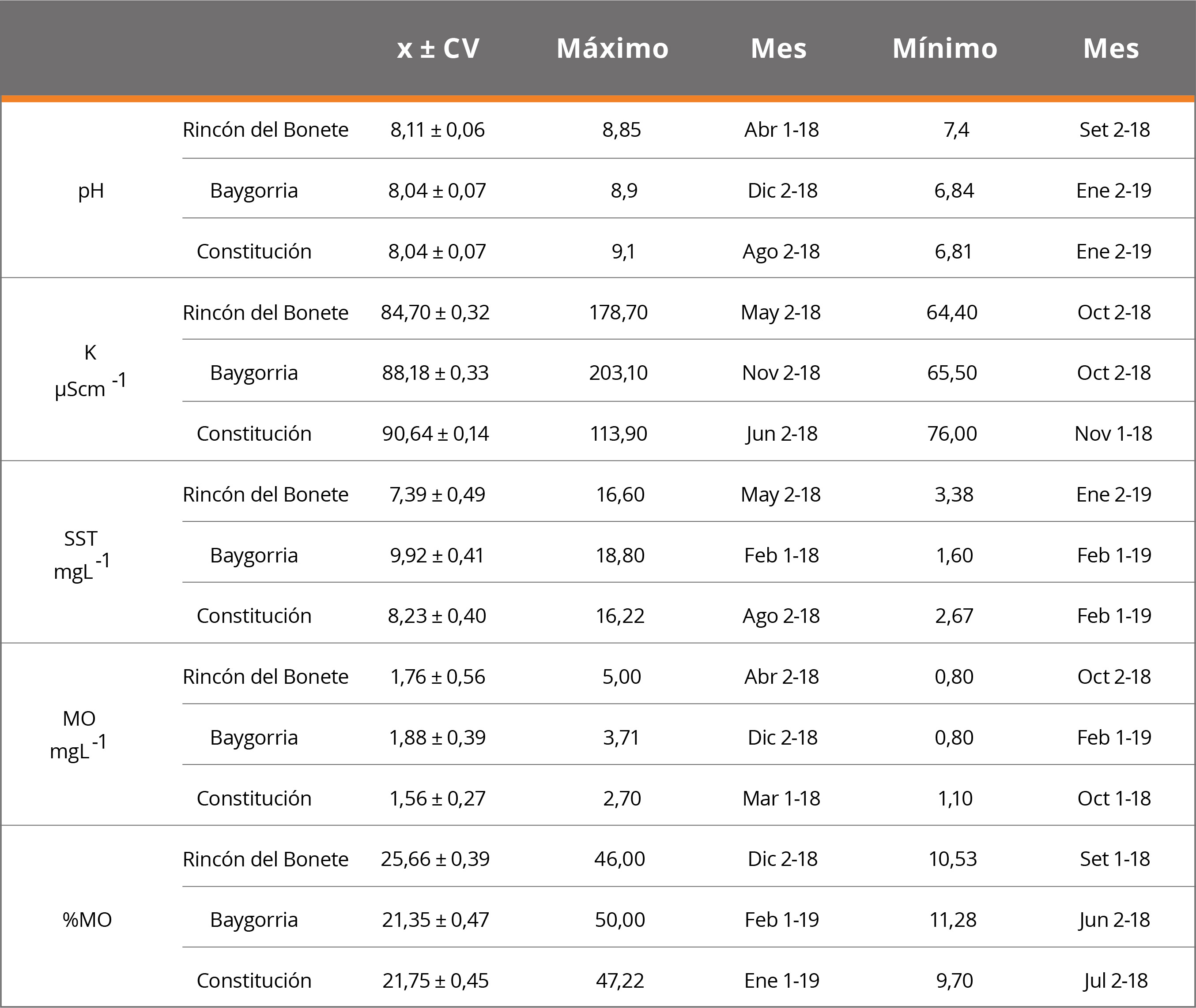 El pH presentó valores alcalinos en el 96% de los casos; los mínimos registrados fueron similares en las tres CH (6,84 Baygorria, 7,40 Rincón del Bonete y 6,81 Constitución). Los máximos se presentaron en Rincón del Bonete (8,85), Baygorria (8,90) y Constitución (9,1). La conductividad osciló entre 64,4μScm-1 y 203,1μScm-1, los mínimos se observaron en la CH Rincón del Bonete (octubre 2018) y los máximos en la CH Baygorria (noviembre 2018). La mayor concentración de sólidos suspendidos totales (SST) se encontró en la CH Baygorria, en febrero (18,8mgL-1), y la concentración máxima de MO en la CH Rincón del Bonete, en abril (5mgL-1). Los %MO mostraron un comportamiento similar en las tres CH, con máximos durante verano (CH Baygorria, febrero) y mínimos durante el invierno (CH Constitución, julio) (Tabla 2). Las tendencias de los parámetros fisicoquímicos en los sistemas de refrigeración de las tres CH situadas en el Río Negro se ajustan con los encontrados en monitoreos de calidad de agua realizados en los embalses de dicho sistema fluvial (Chalar, et al., 2015).