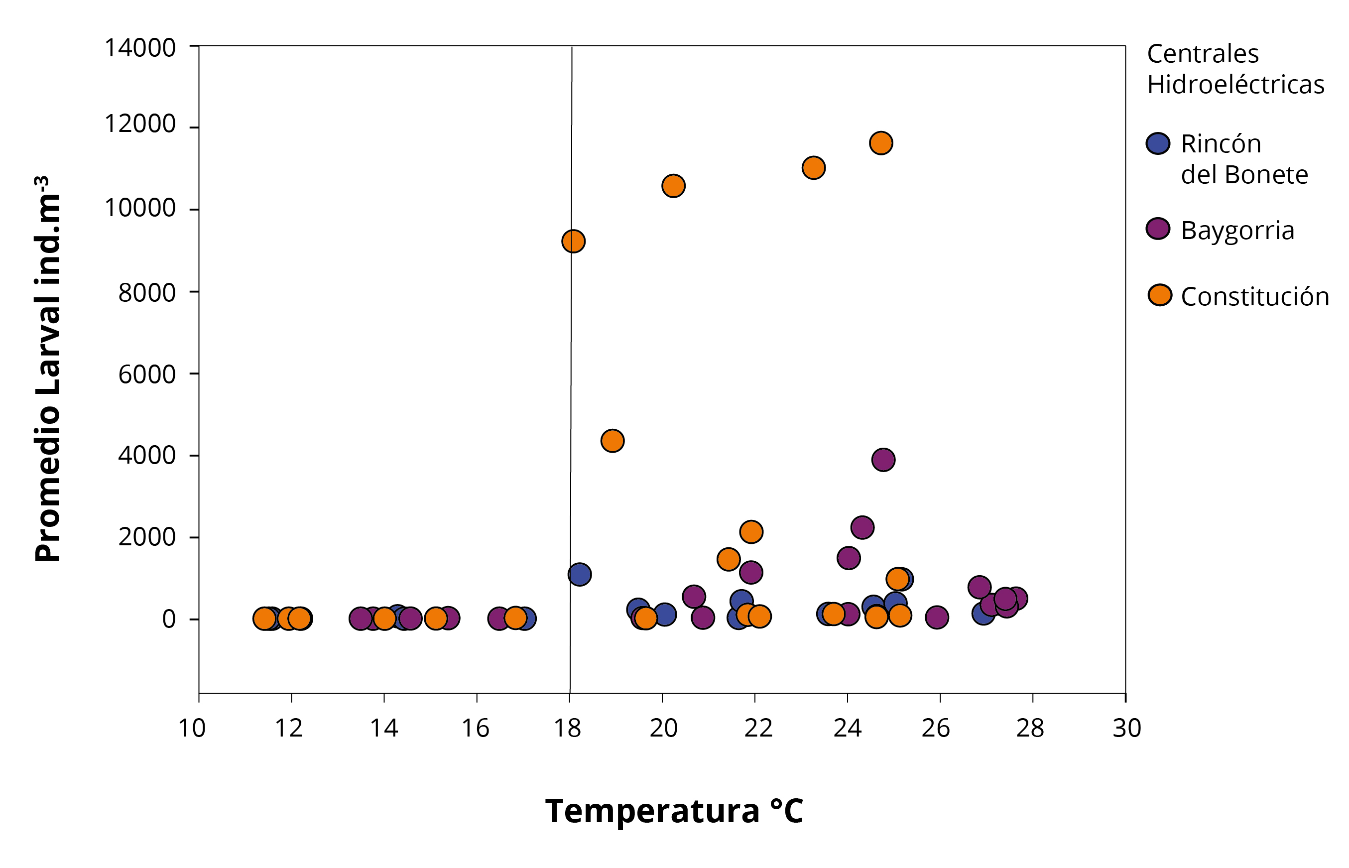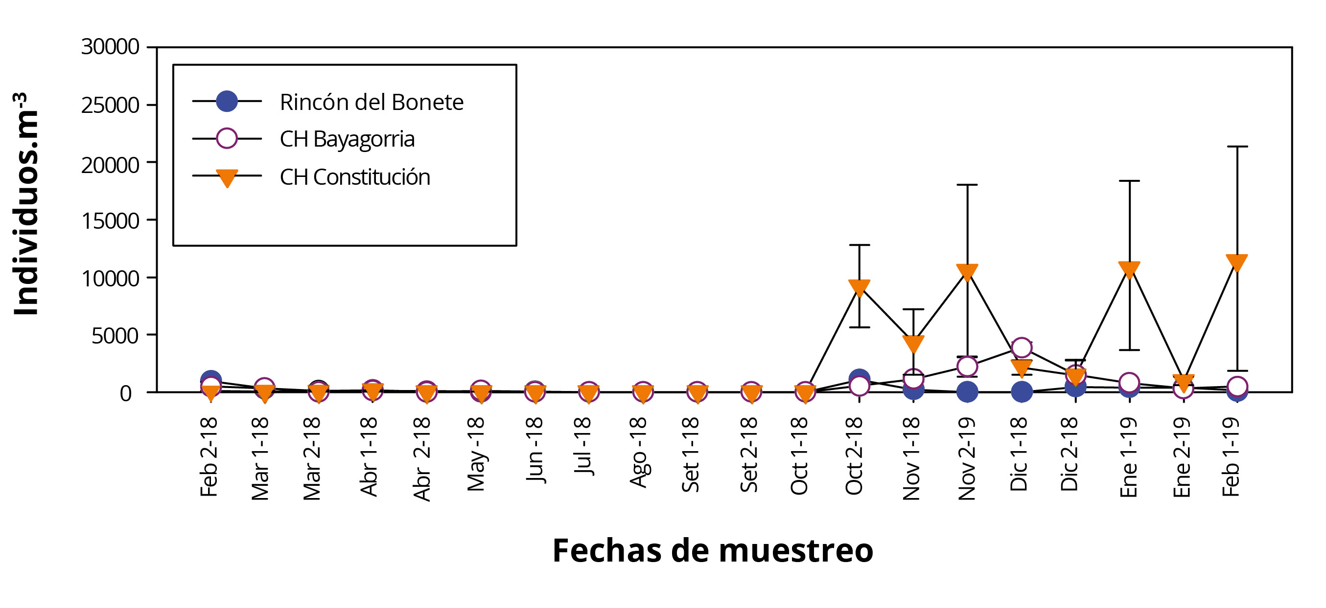 Las máximas densidades larvales se encontraron al inicio de la primavera y mediados del verano, con valores mínimos durante invierno. La CH Constitución presentó la densidad máxima (11603ind.m-3) durante febrero de 2019, donde la densidad larval promedio superó los 6000ind.m-3 a partir de fines octubre, manteniéndose hasta febrero. La CH Baygorria superó los 1000ind.m-3, mientras que Rincón del Bonete no alcanzó los 500ind.m-3.