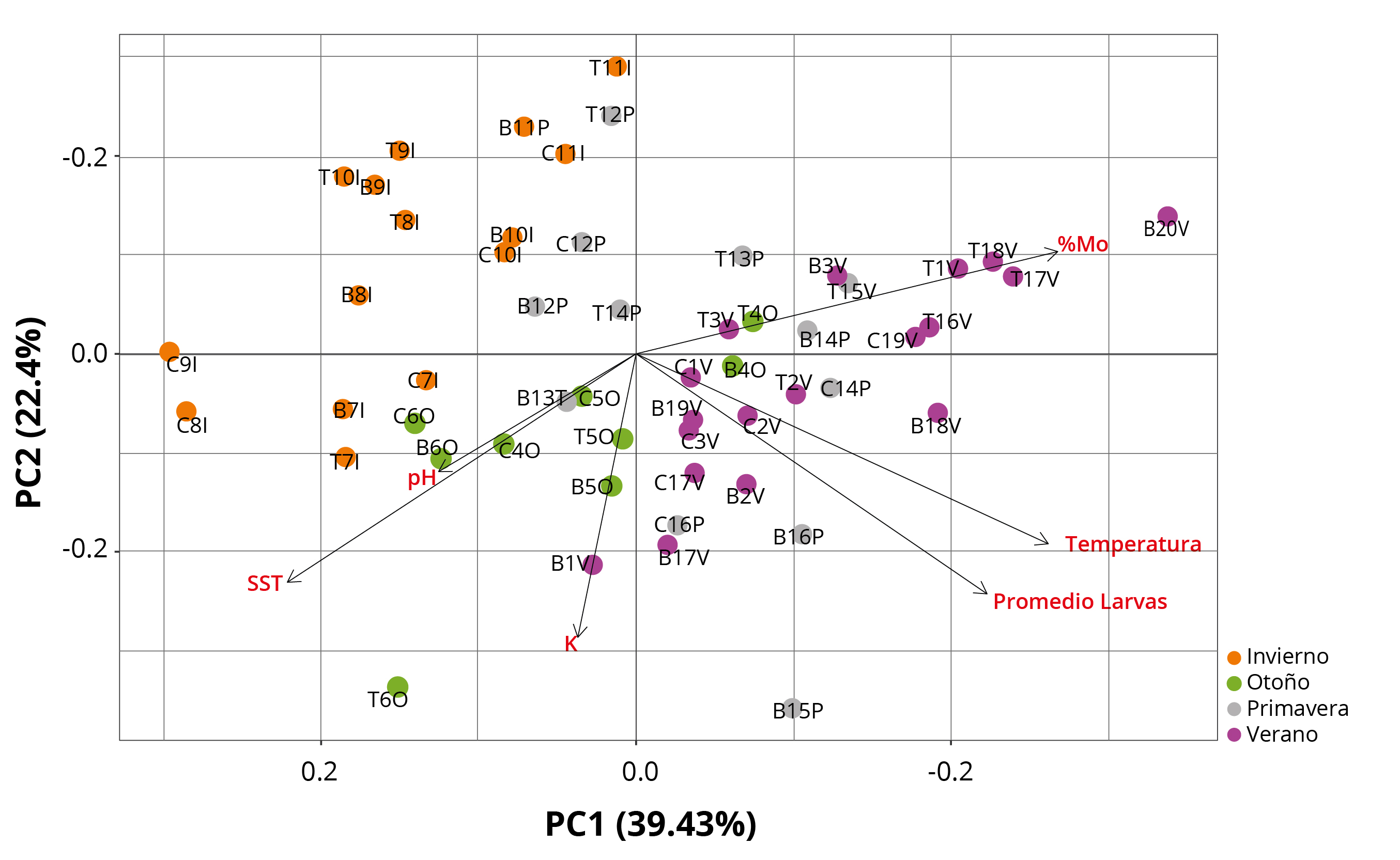 El resultado del ACP (Figura 5) indicó que los dos primeros ejes explican el 62% de la varianza total de los datos. El primer factor explica el 39,4% de la varianza y se puede asociar con los meses de mayor temperatura del agua, en donde las variables de mayor peso correspondieron a la temperatura, al promedio larval y al %MO en agua, con la presencia de un patrón estacional. Por otro lado, el segundo componente explica el 22,4% de la varianza, asociado negativamente con K, SST y pH, aunque no se observa un patrón estacional claro con estas variables. Los meses que se relacionan positivamente con el primer eje corresponden a los meses de verano y primavera, caracterizado por presentar una mayor temperatura del agua y disponibilidad de alimento debido a las floraciones algales reportadas en el embalse (Chalar, et al., 2015). La temperatura y disponibilidad de alimento son factores asociados al aumento de las densidades larvales de L. fortunei en diferentes estudios (Darrigran, et al., 2007; Boltovskoy et al., 2009). En el presente estudio se considera el %MO como un indicador de calidad del alimento, debido a que representa la fracción de los SST que pueden ser asimilados por la especie. El ACP (Figura 5) indica que el %MO y los SST poseen una correlación negativa, lo que implicaría que el aumento de los SST se produciría por partículas inorgánicas, donde las densidades larvales estarían negativamente afectadas por los mismos. Las elevadas cargas de SST inorgánicos afectan a esta especie debido a que son organismos filtradores tanto en estadios larvales como adultos, ocasionando reducción en el área branquial en adultos; lo cual podría dificultar la obtención de alimento y oxígeno, además de aumentar la superficie de los palpos labiales, los cuales son órganos encargados de seleccionar el alimento. Debido a esto se perdería más energía seleccionando las partículas palatables (Paolucci, et al., 2014; Paolucci, 2021). Complementariamente, los SST reducen la penetración de la luz, afectando negativamente al fitoplancton como fuente de alimento para la especie, pudiendo generar reducción del oxígeno disuelto que se ha sugerido como una limitante para el establecimiento de la especie (Dodds y Whiles, 2010; Paolucci, 2021). Por lo anterior, los SST con bajo %MO podrían disminuir la liberación de gametas o generar mortandad larval debido a que son alimentos de baja calidad. De esta manera, el ciclo larval estaría más condicionado por la temperatura del agua, y posiblemente por la calidad del alimento, que por el sitio de colecta (CH). A pesar de estos resultados, existirían otros factores que podrían aportar a la dinámica larval y que no están siendo registrados en el ACP, como pueden ser las poblaciones de adultos en los embalses y sus afluentes, los caudales, el tipo de fitoplancton o la presencia de cianotoxinas (Boltovskoy, et al., 2009).